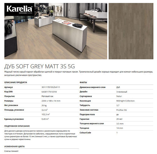 Паркетная доска Karelia OAK SOFT GREY MATT 3S, 14 мм