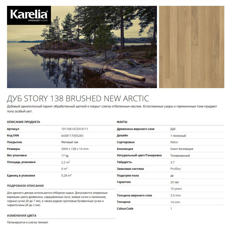 Покрытие лаком - покрытие глянцевым лаком служит деревянному полу надежной и продолжительной защитой. Полуматовый лак дополняет характер древесины, подчеркивая её натуральность. Матовый лак создает впечатление необработанного деревянного покрытия. Брашированная поверхность - обработка поверхности щеткой подчеркивает натуральную основу и текстуру древесины. Результат обработки щеткой зависит от породы дерева. Щетки изготавливаются из различных материалов разной степени жесткости. Обработка щеткой часто производится одновременно с другими видами обработки, такими как морение и нанесение фасок. Natur - в сортировке Natur древесина более разнообразная по текстуре и оттенкам. Естественные узоры и гармоничные тона придают полу особый характер. Встречаются единичные сучки, заболони отсутствуют. Profiloc 2G - замковая система Karelia Profiloc 2G позволяет уложить пол быстро и просто. Благодаря традиционной, самозапирающейся, бесклеевой системе Profiloc, доски пола плотно укладываются. Результатом является красивый пол с практически незаметными соединениями.