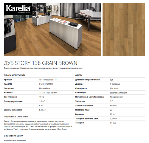 Паркетная доска Karelia OAK STORY 138 GRAIN BROWN, 14 мм
