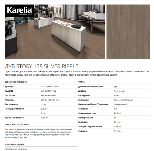 Паркетная доска Karelia OAK STORY 138 SILVER RIPPLE, 14 мм