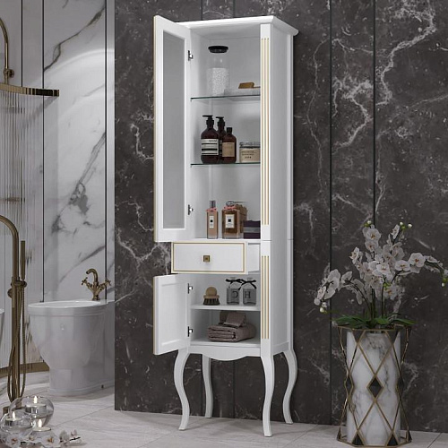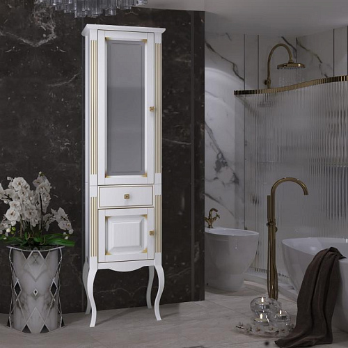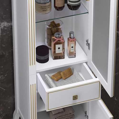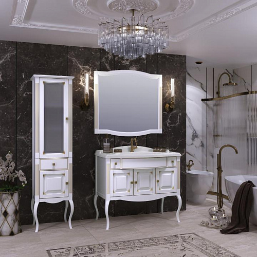 Коллекция ЛАУРА создана нашими дизайнерами в стиле Нео Классика. Коллекция представлена в двух размерах 100 см и 120 см. Фасадные детали изготовлены из массива бука. Особый способ патинирования золотой краской на фасадах придает коллекции дополнительный шарм и очарование. На тумбу из коллекции ЛАУРА можно установить мраморную столешницу с врезной накладной керамической раковиной (для размера 100 см) или раковину из литого мрамора. Особый шик коллекции добавляют золотые и серебряные ручки, инкрустированные кристаллами Swarovski.
