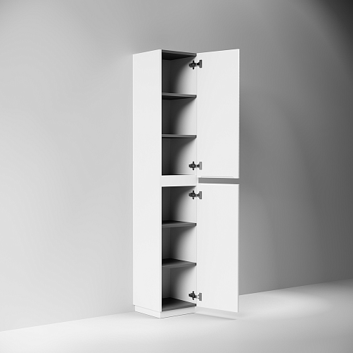 Пенал напольный 350х350х1880 мм Материал корпуса и фасада - МДФ, покрытие ПВХ плёнка Регулируемые ножки для невелирования неровностей пола до 10 мм. В комплекте 6 полок из ЛДСП серого цвета Возможность открывания дверей с правой или левой стороны с помощью перестановки цоколя на этапе монтажа Двери с доводчиком