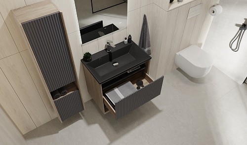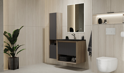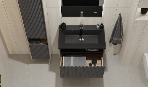 Стильное дизайнерское решение гармонично сочетается с функциональностью, а материалы богатой текстуры с практичностью. Тумбы выполнены из влагостойких материалов и оснащены раковиной из литьевого мрамора. Особенностью тумб данной коллекции является выдвижной органайзер для хранения мелочей. Вариативность цветовых решений и размерного ряда является значимым преимуществом коллекции.
