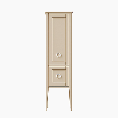Высокий напольный пенал в цвете капучино (бежевый) матовый из массива ясеня с эффектом открытой поры с распашной дверцей и выдвижным ящиком. Фасад украшен классической фурнитурой. Пространство за дверцей разделено несколькими регулируемыми полками. Петли для крепления дверцы расположены справа.