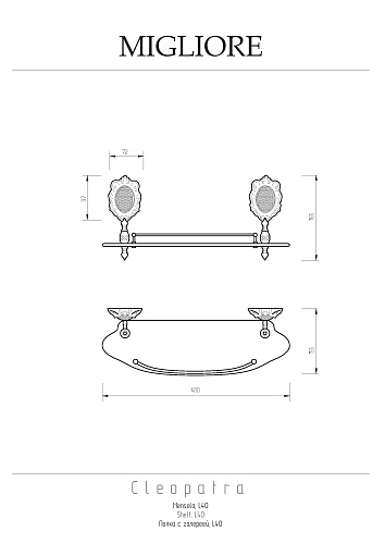 Полка с галереей коллекции Cleopatra бренда Migliore длиной 40 см — это функциональный аксессуар для ванной комнаты в классическом стиле. Полка вешается над раковиной. На ней можно разместить все необходимые косметические средства, которые будут всегда у вас под рукой. Ограничитель по переднему краю полки не позволит упасть тюбикам и предметам. Стекло легко чистится тряпочкой и/или средством для чистки стекол. Внимание: бронзовое покрытие достаточно деликатное и для ухода рекомендуется протирать изделие мягкой безворсовой тряпочкой с мыльным раствором и вытирать насухо или использовать чистящее средство бренда Migliore для смесителей и аксессуаров с деликатными покрытиями бронза, золото, медь.