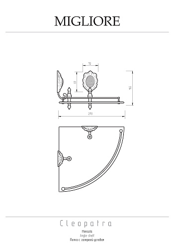 Полка с галереей угловая коллекции Cleopatra бренда Migliore — это функциональный аксессуар для ванной комнаты в классическом стиле. На ней можно разместить все необходимые косметические средства, которые будут всегда у вас под рукой. Ограничитель по переднему краю полки не позволит упасть тюбикам и предметам. Стекло легко чистится тряпочкой и/или средством для чистки стекол. Внимание: бронзовое покрытие достаточно деликатное и для ухода рекомендуется протирать изделие мягкой безворсовой тряпочкой с мыльным раствором и вытирать насухо или использовать чистящее средство бренда Migliore для смесителей и аксессуаров с деликатными покрытиями бронза, золото, медь.