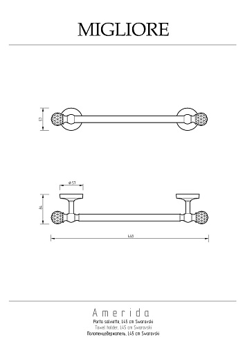 Полотенцедержатель коллекции Amerida бренда Migliore – функциональный аксессуар для ванной комнаты — чтобы повесить его достаточно небольшого пространства, и вы можете развернуть его держатели в одну или другую сторону в зависимости от наличия места на стене. Аксессуар украшен кристаллами Сваровски. Изделие выполнено из высококачественной латуни и имеет гальваническое покрытие золотом 24 карата. Внимание: золотое покрытие очень деликатное и для ухода рекомендуется использовать чистящее средство бренда Migliore для смесителей и аксессуаров с деликатными покрытиями бронза, золото, медь и протирать мягкой ветошью.