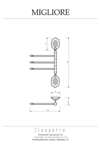Полотенцедержатель тройной поворотный коллекции Cleopatra бренда Migliore длиной 35 см очень удобен в использовании — для него достаточно небольшого пространства, и держатели можно развернуть в одну или другую сторону, в зависимости от наличия места на стене. Розетки аксессуара имеет необычную форму, и удобный крепеж. Внимание: бронзовое покрытие достаточно деликатное и для ухода рекомендуется протирать изделие мягкой безворсовой тряпочкой с мыльным раствором и вытирать насухо или использовать чистящее средство бренда Migliore для смесителей и аксессуаров с деликатными покрытиями бронза, золото, медь.