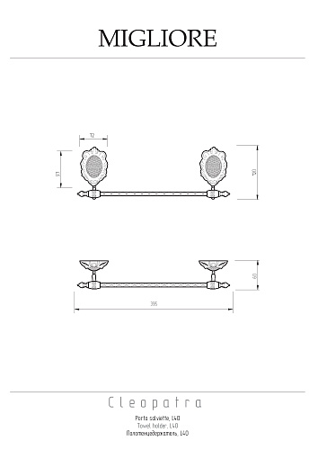 Полотенцедержатель коллекции Cleopatra бренда Migliore – необходимый аксессуар для ванной комнаты. Его длина 40 см, и это позволяет разместить его даже на небольшом пространстве. Используется, как правило, для небольшого полотенца для рук. Также удобно разместить рядом с биде. Розетки аксессуара имеет необычную форму, и удобный крепеж. Изделие выполнено из латуни и имеет высококачественное хромо-никелевое покрытие, которое при правильном уходе надолго сохранит свой блеск. Рекомендуется использовать чистящее средство бренда Migliore для смесителей и аксессуаров с хромированным покрытием.