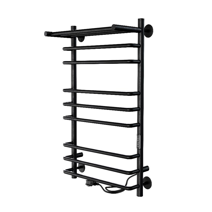 Полотенцесушитель электрический INDIGO Brace Lux в классической форме «лесенка». С помощью терморегулятора можно регулировать температуру в диапазоне от 40 до 50 градусов (с шагом 5 градусов) — уровень температуры показывается количеством горящих светодиодов. Таймер можно настроить на отключение через 2, 4, 6 часов. Подключение осуществляется двумя способами: скрытое подключение к электропроводке через модуль скрытого подключения в стену или прямым электропроводом длиной 1,1 метра в розетку.