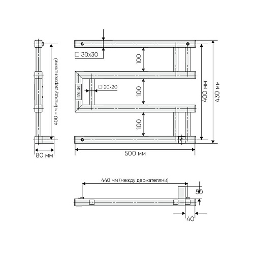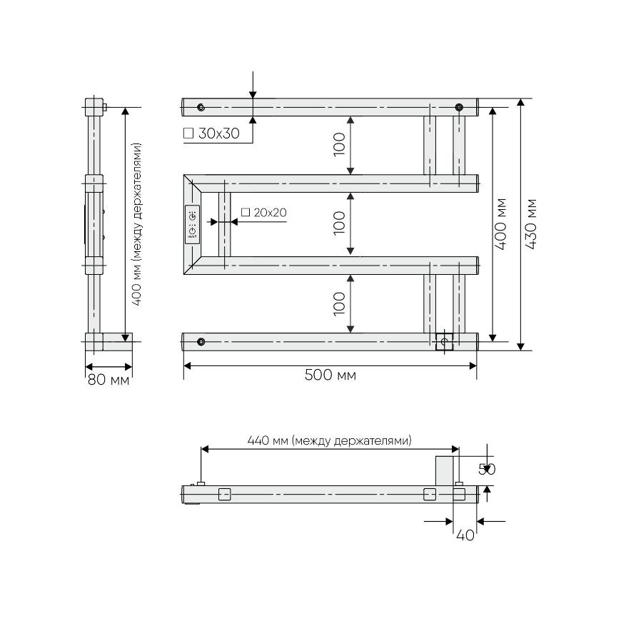 Оснащение Полотенцесушитель, гарантийный талон, 3 квадратных держателя, набор для монтажа.