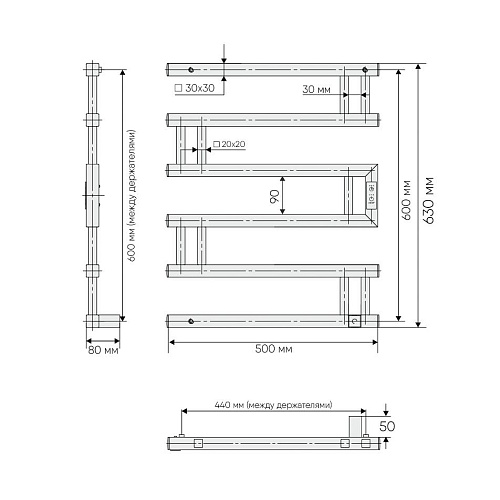 Оснащение Полотенцесушитель, гарантийный талон, 3 квадратных держателя, набор для монтажа.