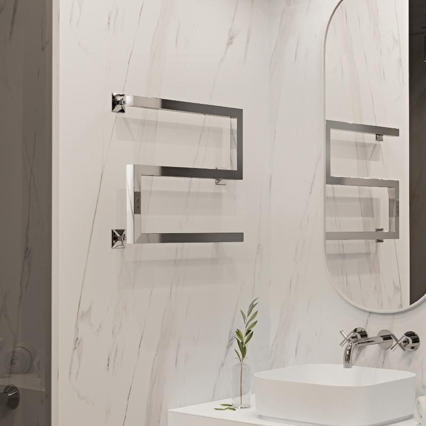 Полотенцесушитель электрический INDIGO Sparta хром в размере 400х500 (ВхШ) выбирают за его технологичность и универсальность. Модель имеет терморегулятор нагрева, у которого три режима: 40, 45, 50 градусов и таймер на отключение через 2, 4, 6 часов. Подключение осуществляется двумя способами: скрытое подключение к электропроводке через модуль скрытого подключения в стену или прямым электропроводом. Длина прямого провода 1,1 метр. Изделие выполнено из нержавеющей стали. Полотенцесушитель относится к энергоэффективным изделиям, потребляемая мощность в данном размере 61 Вт. Специальная технология нагревательного кабеля защищает полотенцесушитель от перегрева, что влияет на длительные сроки службы. В комплектации идут 3 телескопических держателя, комплект монтажа и гарантийный паспорт. Полотенцесушитель INDIGO Sparta застрахован и имеет гарантию 3 года. Выбирая INDIGO вы получаете надежный продукт с гарантией качества от российского производителя