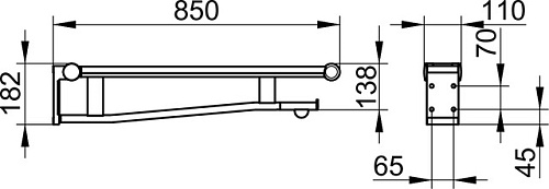 Откидывается наверх, исполнение с ограничением хода, верх поручня имеет пластиковую оболочку, со съемным держателем туалетной бумаги (с роликовым ограничителем).