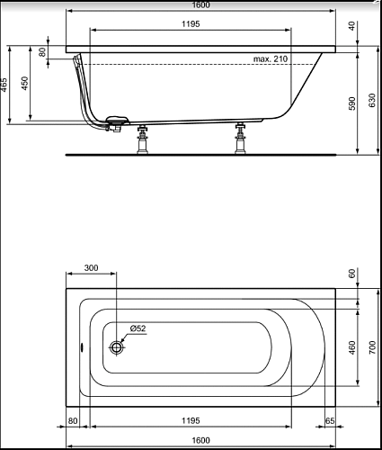 HOTLINE Прямоугольная ванна для встраиваемой установки, без отверстий под смеситель, отверстие слива 52 мм, вместимость 210 л, без ножек.