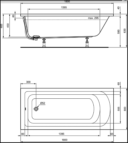 HOTLINE Прямоугольная ванна для встраиваемой установки, без отверстий под смеситель, отверстие слива 52 мм, вместимость 295 л, без ножек.