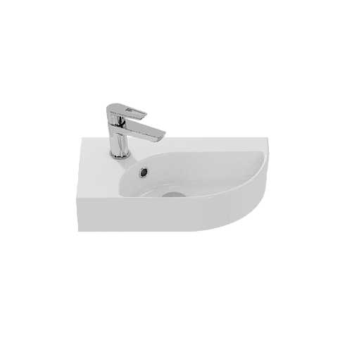 Угловая раковина CAMEO левая размером 45 см. Имеет отверстие под смеситель, а также отверстие перелива. Отлично подходит для маленьких санузлов.