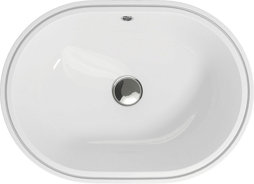 Овальная, встраиваемая снизу столешницы раковина CASPIA, размер раковины 55 см. Имеет отверстие под смеситель, а также отверстие перелива.