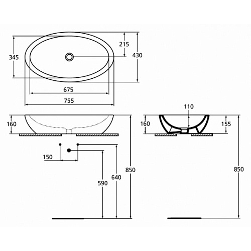 STRADA Умывальник-чаша овальный 75X42 см, без отверстия под смеситель, без перелива, с крепежом E009567, с монтажным шаблоном, для установки со смесителем с удлиненным корпусом и специальным донным клапаном