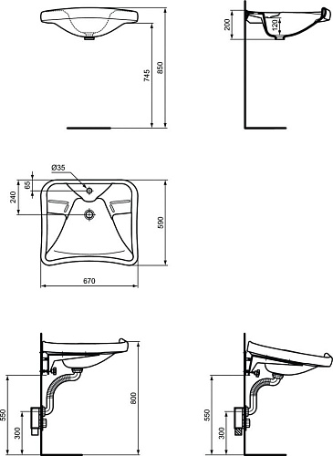 ATLANTIS Специальная раковина для инвалидов, 1 отверстие под смеситель. Для монтажа на опорах J51.. своих крепежных отверстий не имеет. Для монтажа с сифоном J200567/J200667.