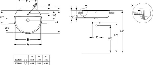 Раковина Ideal Standard E806501 Connect полувстраиваемая 45 см, с 1-м отверстием под смеситель, Euro White (евробелый)