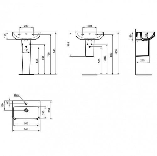 I.LIFE S Раковина с отверстием под смеситель, с отверстием перелива, без крепежа. Узкая проекция - 38 см. Для монтажа с колонной T473901 или полуколонной T474001 или соло с сифоном.