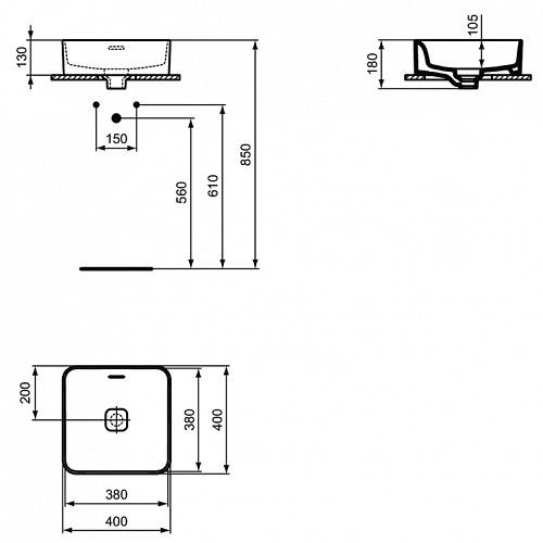 Раковина Ideal Standard T296301 Strada II Square Vessel накладная 40 см, без отверстия под смеситель, Euro White (евробелый)