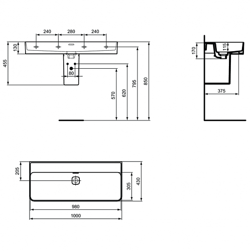 Раковина Ideal Standard T364001 Strada II подвесная 100х43 см, без отверстия под смеситель, Euro White (евробелый)