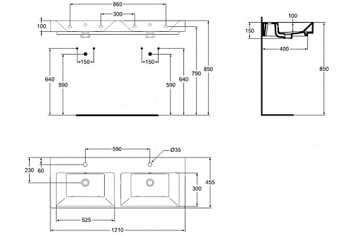 STRADA Двойной умывальник 120 см, два отверстия под смесители готовы, с отверстиями перелива, с монтажным шаблоном, без крепежа (рекомендуемый крепеж M10 x 140 мм, необходимо 2 комплекта)