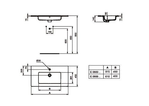 Раковина Ideal Standard E066801 Tempo Vanity встраиваемая 60х45 см, с 1-м отверстием под смеситель, Euro White (евробелый)