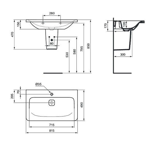 TONIC II Умывальник с 1-м отверстием под смеситель, керамическая накладка слива (1 шт. в комплекте). Для монтажа с мебелью TONIC II (новый сифон IdealFlow - 1 шт. вкл. в комплект подстолья TONIC II R4303). Для настенного монтажа.