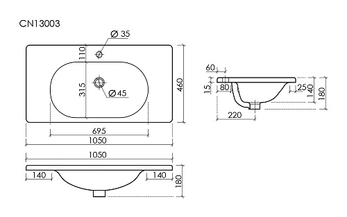 Раковина накладная Sabo, прямоугольная с отверстием под смеситель 1000x460x130, цвет белый. Для установки на мебель, арт. CN13003