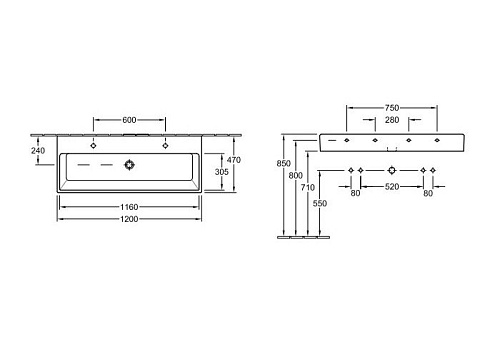 Раковина шлифованный низ, для двух 1-позиционных смесителей, отверстия для смесителей выбиты, без перелива , размер: 120х47см , цвет: белый альпин ,
