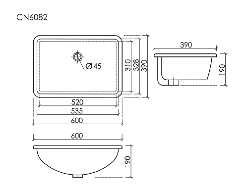 Раковина встраиваемая снизу CERAMICANOVA Era, прямоугольной формы с отверстием слива- перелива, 600x390x190 мм, с крепежом и шаблоном для установки, цвет белый, арт. CN6082