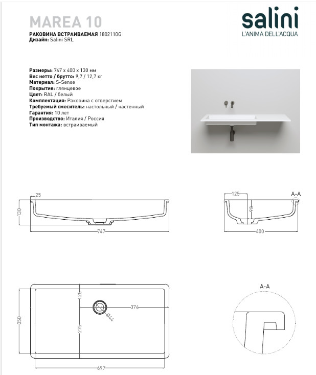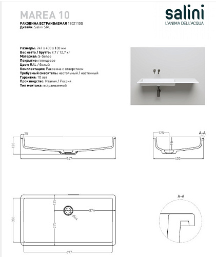 Раковина встраиваемая SALINI Marea 1802110G