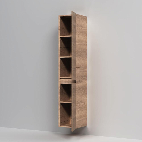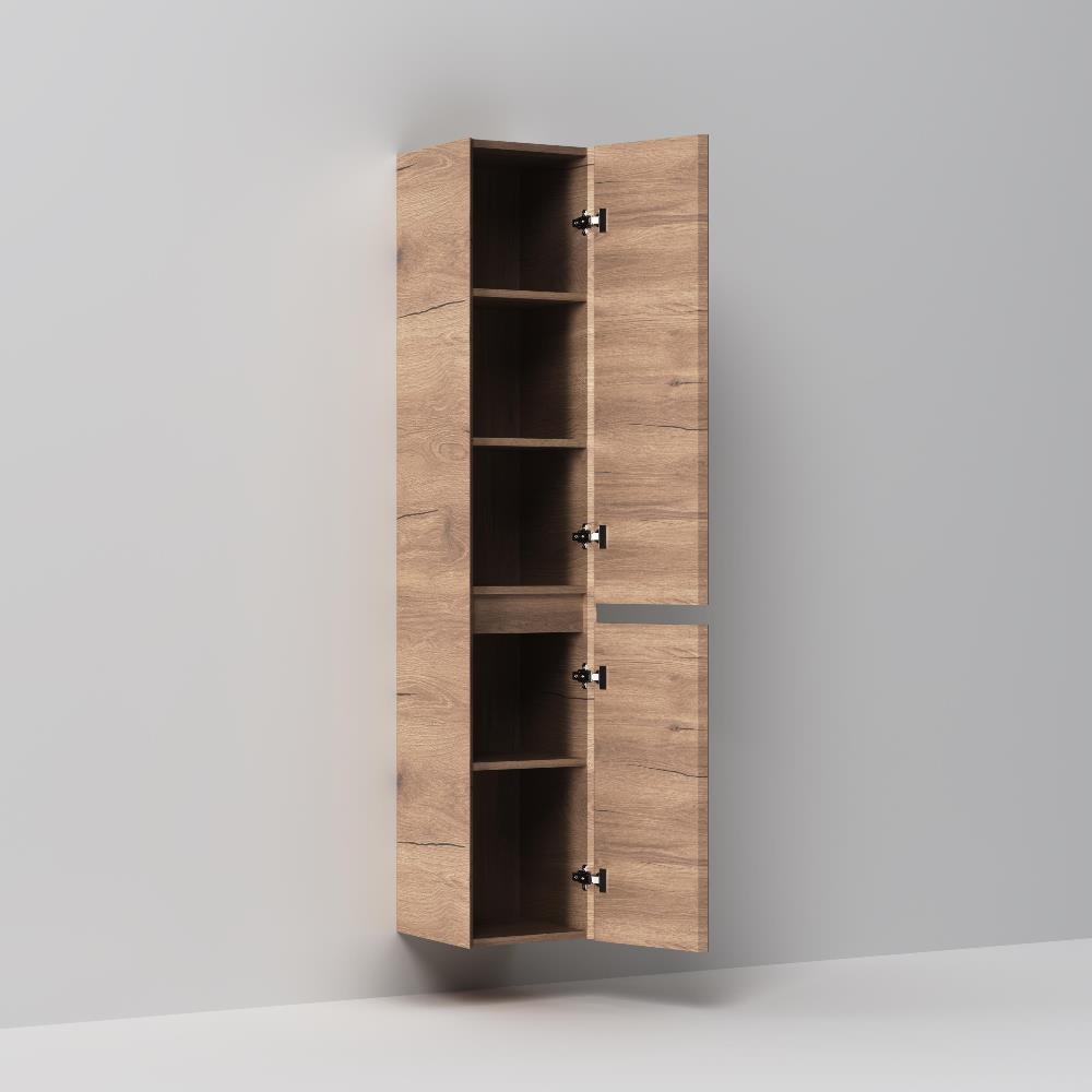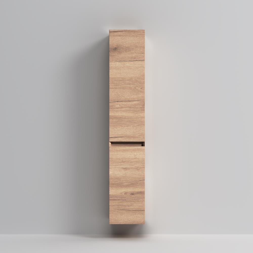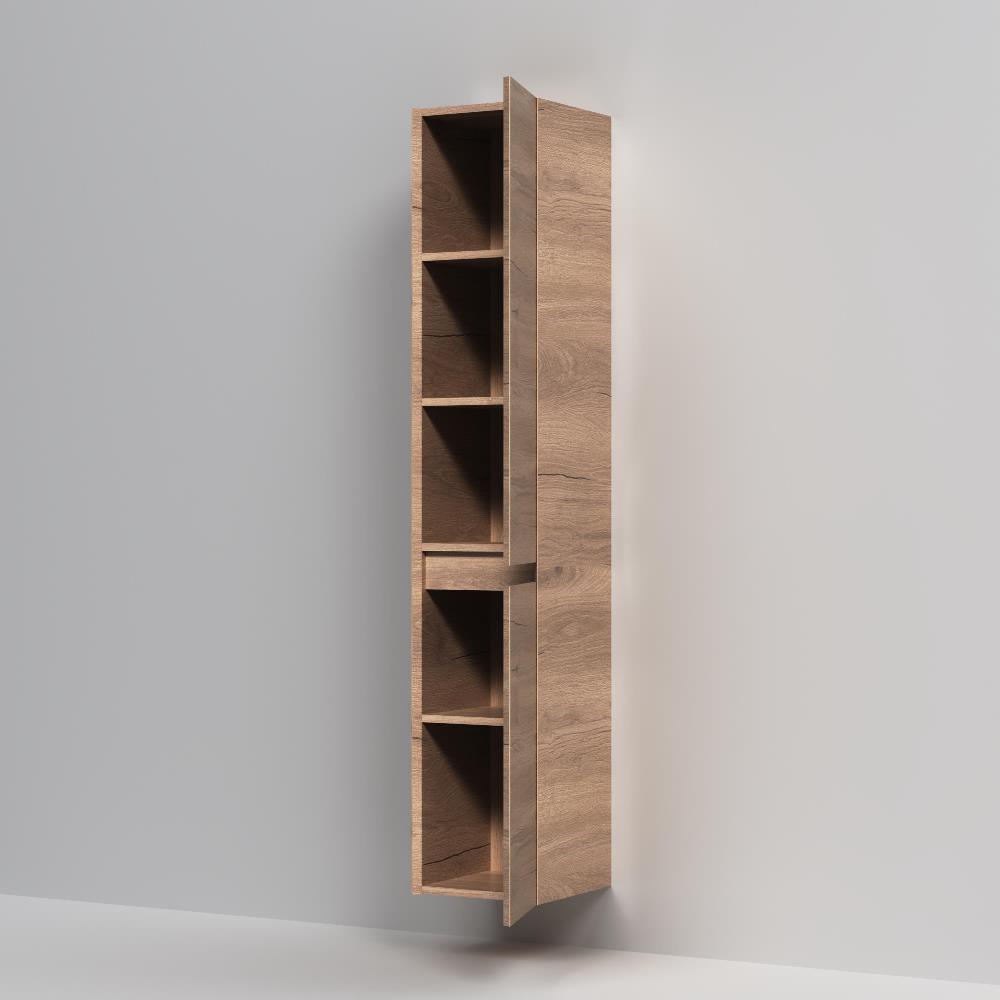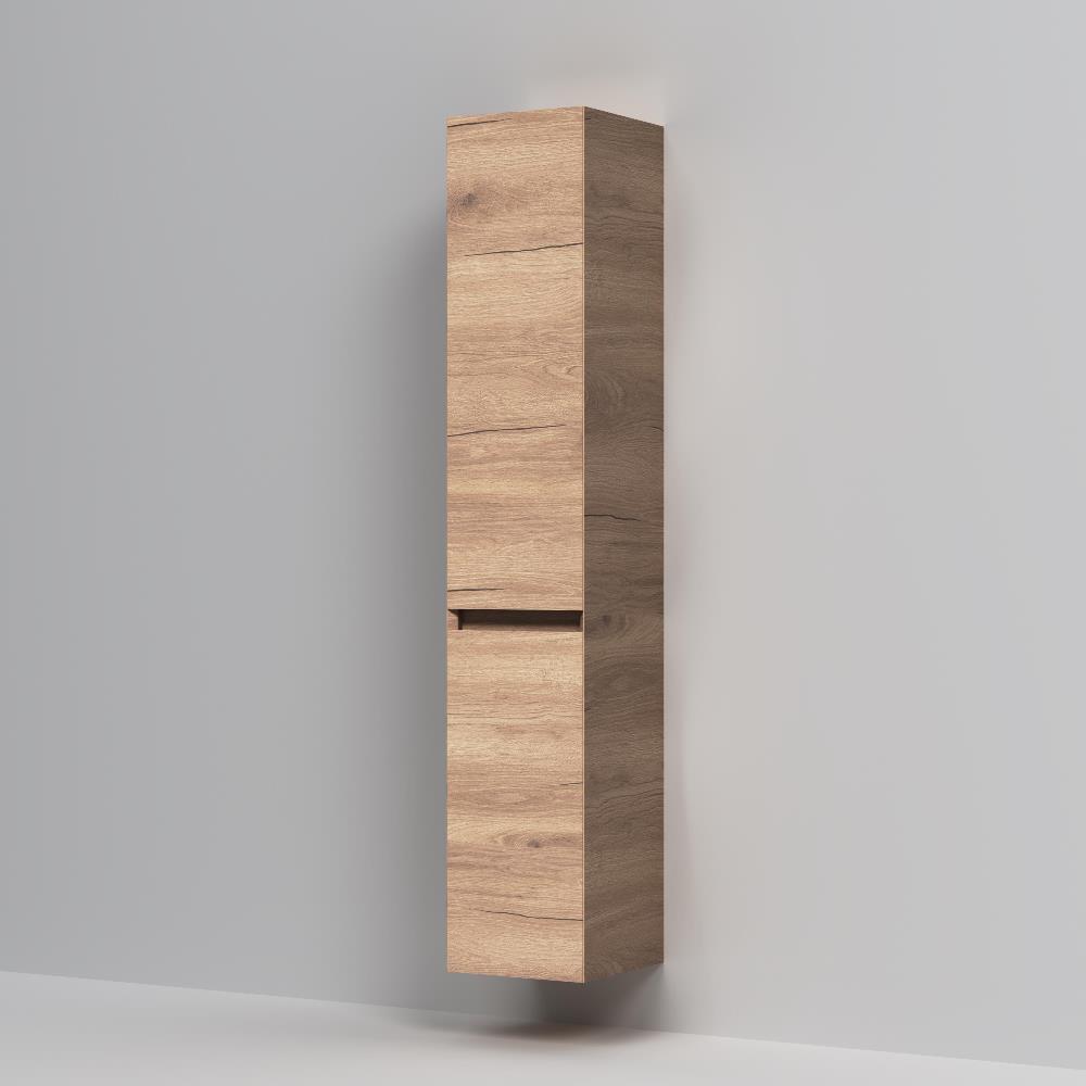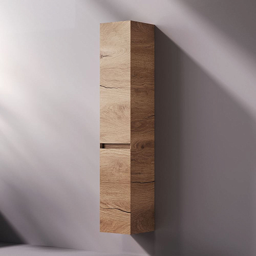 Подвесной шкаф-пенал Above — баланс форм в актуальной минималистичной эстетике с утонченным силуэтом. Коллекция Above играет с пространством создавая ощущение лёгкости и простора. Это достигается за счет аккуратного запила фасада и корпуса под углом 45°. Каждая линия работает на эффект невесомости и создаёт ощущение простора даже в компактной ванной комнате. Дизайн разработан студией DanelonMeroni (Великобритания / Италия) и отражает философию коллекции — максимум визуального эффекта без лишних деталей. Подвесной формат шкафа-пенала легко интегрируется в различные планировки ванных комнат поддерживая ощущение порядка и структурированности пространства. Покрытие под текстурированное дерево разработано эксклюзивно студией DanelonMeroni. Тёплый глубокий цвет и выразительный древесный рисунок подчеркивают архитектурное настроение коллекции придавая интерьеру современный и премиальный характер на долгие годы. ""