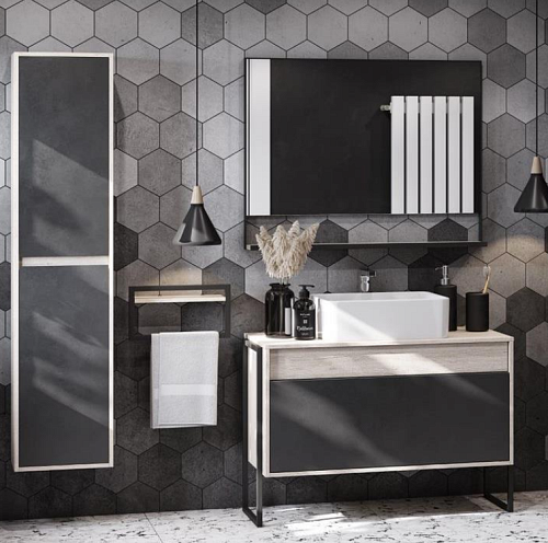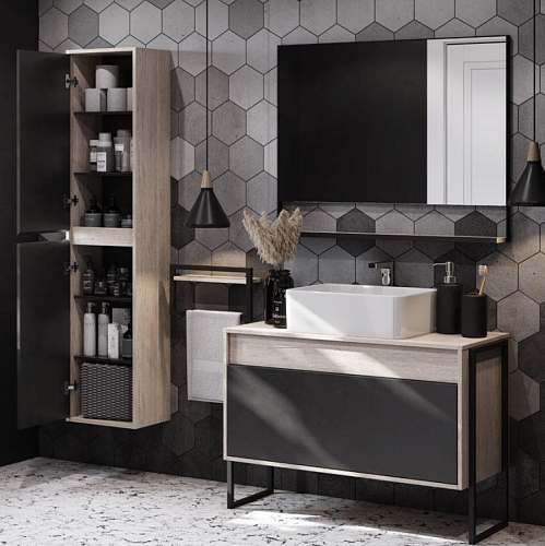 В качестве дополнительного места для хранения можно использовать шкаф-колонну с двумя отделениями. Фасады, как и у тумбы, выполнены в цвете графит с эффектом perfect touch и снабжены удобными интегрированными ручками. За фасадами находятся полочки, на которые можно разместить все необходимые принадлежности. Верхняя и нижняя полки имеют возможность регулировки по высоте.