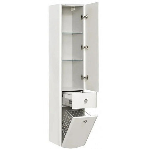 Изящный подвесной шкаф-колонна выполнен в популярном сегодня неоклассическом стиле из влагостойкой ламинированной плиты и высококачественной МДФ, окрашен в белый цвет с высокой степенью глянца полиэфирной краской ультрафиолетового отверждения. Внутреннее наполнение изделия имеет серый цвет. За верхним фасадом с декоративной ручкой расположены регулируемые по высоте стеклянные полки, на которых можно разместить все необходимые в ванной комнате принадлежности. Двустенный ящик полного открывания идеально подойдет для мелочей. Также шкаф оборудован корзиной для белья-функциональной деталью, незаменимой в ванной комнате. Петли данного шкафа-колонны, расположенные справа, оснащены специальными доводчиками, что обеспечивает мягкое и бесшумное закрывание.