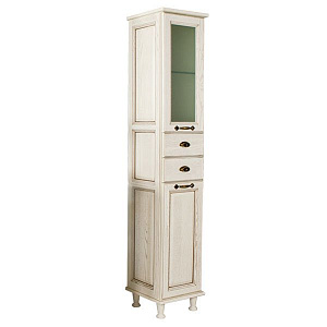 Шкаф-колонна Акватон Жерона – изысканное изделие в классическом стиле, предназначенное для хранения вещей в ванной комнате. Эта вместительная и функциональная модель размерами 35x168,2x34,5 см хорошо подходит для компактных помещений благодаря небольшой ширине. Фасад пенала, изготовленный из массива дерева белого  Цвета, богато декорирован строгой гравировкой, изящными металлическими ручками в  Цвете золото и стеклянной вставкой. Такой дизайн в классическом стиле выглядит элегантно и роскошно в любом помещении.    Эта модель имеет левостороннюю ориентацию.    Шкаф устанавливается на пол на четыре прочные ножки в белом  Цвете, которые включены в комплект к изделию.    Пространство внутри шкафа за распашными дверцами разделено на части удобными стеклянным полками.    В середине расположены два небольших ящика, работающих по системе полного выдвижения для эффективного использования места.    Ручки на фасаде, изготовленные из специального влагостойкого сплава, имеют сложный декоративный дизайн с кристаллами.