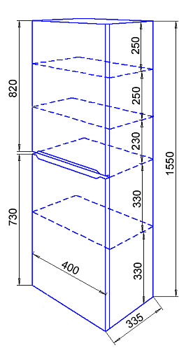 Пенал подвесной в собранном виде. Между верхним и нижним ящиком встроенная светодиодная подсветка Фасад и бока крашеные. Два распашных фасада. В верхнем распашном фасаде две полочки, в нижнем распашном фасаде одна полочка.