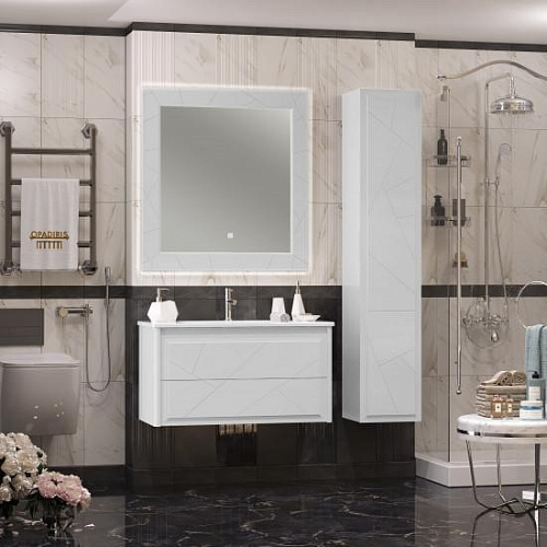 Коллекцию ЛУИДЖИ украшают сложная фрезеровка фасадов строгими линиями и декоративная подсветка по периметру зеркала, которое оснащено сенсорным выключателем. Тумбы дополняются современными ультратонкими керамическими слим-раковинами в размерах 70 см и 90 см. Коллекция изготавливается в цветах Белый матовый и серый матовый. Мебель оснащена механизмами плавного закрывания Hettich (Германия).