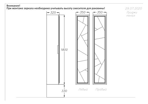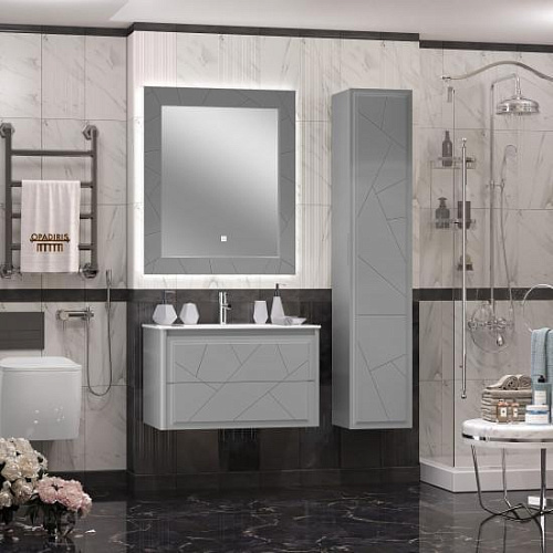 Коллекцию ЛУИДЖИ украшают сложная фрезеровка фасадов строгими линиями и декоративная подсветка по периметру зеркала, которое оснащено сенсорным выключателем. Тумбы дополняются современными ультратонкими керамическими слим-раковинами в размерах 70 см и 90 см. Коллекция изготавливается в цветах Белый матовый и серый матовый. Мебель оснащена механизмами плавного закрывания Hettich (Германия).