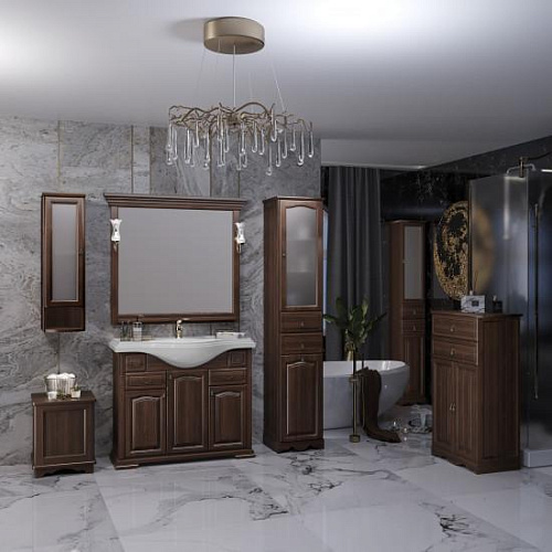 Коллекция РИСПЕКТО символизирует лучше традиции неоклассики в сочетании с необыкновенной функциональностью и простотой дизайна. Успех и уникальность коллекции формируется несколькими вариантами отделок, а также размерным рядом моделей и глубокой керамической раковиной. Завершенность стилю коллекции РИСПЕКТО придают сложные филенчатые фасады мебели. Несколько вариантов пеналов — узкий, стандартный (с бельевой корзиной) и двухстворчатый — удачно завершают комплектацию коллекции. Мебель оснащена механизмами плавного закрывания Hettich (Германия).