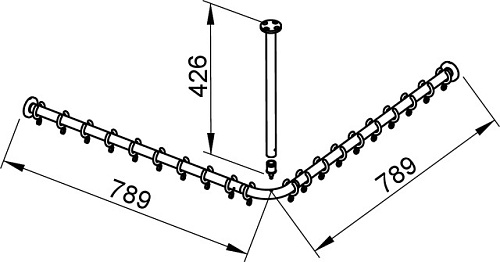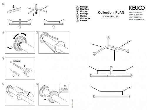 Оснащение Три настенных крепления, две штанги для душевой занавески 700 мм, штанга угловая 90° для квадратных поддонов, опора к потолку 400 мм, две упаковки колец для занавески, белые (количество в упаковке: 10 шт.), соединительный элемент.