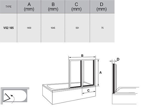 Удобство и практичность – основные характеристики защитной стеклянной шторки VS2. Обе секции конструкции подвижны; если нужно полностью открыть ванну, достаточно сложить шторку по направлению внутрь. Во время принятия душа можно повернуть крайнюю створку под углом 90° и получить подобие душевой кабинки. Модель VS2 используется с ваннами Ravak, имеющими прямой внешний борт (Vanda II, Lilia, Classic, Sonata), подходит для других стандартных прямоугольных ванн.