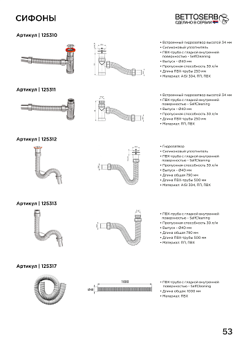Сифон для раковины/умывальника/кухонной мойки серый BETTOSERB 1.1/4"х40мм без выпуска, с гидрозатвором и гибкой гофрированной трубой Сифон под раковину изготовлен из высокопрочного пластика, который устойчив к высоким и низким температурам, а также не боится агрессивной бытовой химии. Сифон оснащен гидрозатвором высотой 34мм, поэтому ваш дом будет надежно защищен от неприятных запахов. Сифон оснащен гибкой самоочищающейся гофрированной трубой - SelfCleaning. 100% гарантия от протечек в местах гибких соединений. Срок службы слива сантехнического не менее 50 лет.