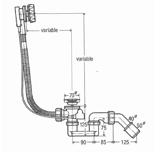 Сифон и донный клапан для ванн с переливом, полуавтоматический.