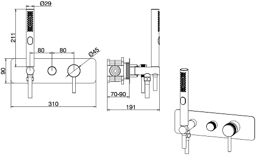 Оснащение Душевая лейка, душевой шланг, переключатель потоков, шланговое подключение