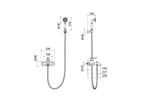 Оснащение 1. Смеситель 2. Душевой гарнитур (лейка, шланг, настенный держатель для лейки) 3. S-образные эксцентрики 4. Декоративные отражатели