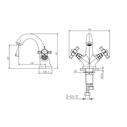 Смеситель для умывальника, с гибкой подводкой,неповоротный излив в комплекте с донным клапаном, бронзовый